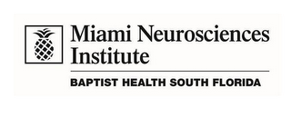 DM0000: The mark consists of the words "MIAMI NEUROSCIENCES" with the underlined word "INSTITUTE" positioned below the terms "MIAMI NEUROSCIENCES" and the words "BAPTIST HEALTH SOUTH FLORIDA" positioned below the term "INSTITUTE". Positioned to the left of the words "MIAMI NEUROSCIENCES INSTITUTE" is an image of a pineapple appearing within the center of an outlined square.
