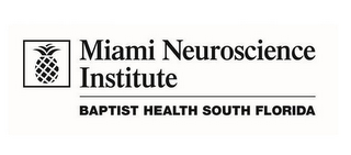 DM0000: The mark consists of the words "MIAMI NEUROSCIENCE" with the underlined word "INSTITUTE" positioned below the terms "MIAMI NEUROSCIENCE" and the words "BAPTIST HEALTH SOUTH FLORIDA" positioned below the term "INSTITUTE". Positioned to the left of the words "MIAMI NEUROSCIENCE INSTITUTE" is an image of a pineapple appearing within the center of an outlined square.