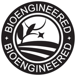 DM0000: The mark consists of a circle with a bottom portion shaded in a first hill shape that extends to approximately the center of the circle. The circle also consists of a second hill shape, indicated by contour lines, that extends across the lower portion of the circle. The upper left of the circle has a stem with two leaves and a four pointed stellate design element and a curved band stylized as the sun. There are three concentric rings circumscribing the circle. The outermost ring has the literal element "BIOENGINEERED" in upper case letters arranged in an arcuate shape across the top of the circle, with a four pointed stellate design element placed before and after the literal element "BIOENGINEERED". The outermost ring also has the literal element "BIOENGINEERED" in upper case letters arranged in an arcuate shape across the bottom of the circle.