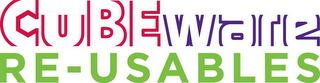 - DM0000: The mark consists of the word "CUBEWARE" with the word "CUBE" in red and the word "WARE" in purple. Below that wording is the word "RE-USABLES" is light green. The color white represents background areas and is not part of the mark.