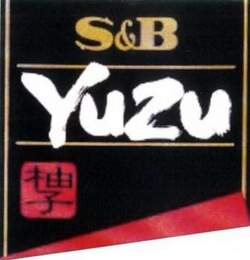 - DM0000: The mark consists of the stylized yellow wording "S&B" above the stylized white wording "YUZU" with yellow lines above and beneath the term "YUZU". To the lower left is a red square featuring stylized stacked black non-Latin characters that transliterate to "YUZU", all of which is inside a black trapezoid border featuring a red triangular design at the bottom. The left and right portion of the trapezoid border features a yellow vertical line. The color white beneath the mark represents background and/or transparent areas and is not part of the mark.