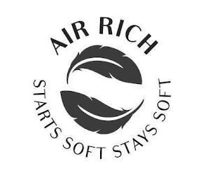 DM0000: The mark consists of the wording "AIR RICH" in stylized lettering forming a semi circle above two feather designs and having the phrase "STARTS SOFT STAYS SOFT" in stylized lettering forming a semi circle at the bottom portion of the mark.