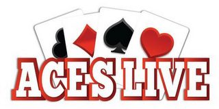 - DM0000: The mark consists of four playing cards fanned as in a hand in a card game, each white card displaying the symbol of an ace, from left to right a black club, a red diamond, a black spade, and a red heart with the words "ACES LIVE" in stylized format, the letters appearing in white, and outlined in red, superimposed over the bottom of the cards.