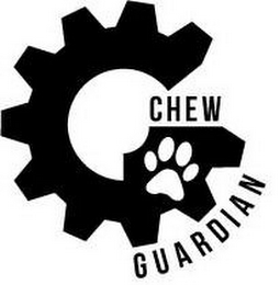 - DM0000: The mark consists of the wording "CHEW GUARDIAN" and a black gear shape with the upper right corner of the gear removed so that it looks like a capital letter "G", with a paw print in the lower right corner of the gear-shaped letter "G". The word "CHEW" is placed in the middle right of the gear-shaped letter "G", above its horizontal cross bar. The word "GUARDIAN" curves below the lower right corner of the gear-shaped letter "G".