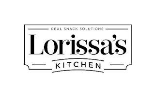 DM0000: The mark consists of "REAL SNACK SOLUTIONS" in upper case letters with a thick, straight line on either side of the words. The words "REAL SNACK SOLUTIONS" are in smaller print above the word "Lorissa's". The word "Lorissa's" is capitalized, in stylized letters, and in large print, with the word "KITCHEN" below it. The word "KITCHEN" is in upper case letters between two arched lines and with a thick, straight line on either side of the word "KITCHEN". The words "REAL SNACK SOLUTIONS LORISSA'S KITCHEN" are all in black letters within a black badge design against a white background.