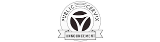 DM0000: The mark consists of a design consisting of concentric circles that contain the words "PUBLIC CERVIX" in stylized form on top of the outer circular portion with three curved horizontal lines between the words "PUBLIC" and "CERVIX". The circular design also includes an inner circle containing a triangle design where the triangle's sides are curved inward. A banner overlaps the bottom of the circular design and contains the word "ANNOUNCEMENT" in stylized form.