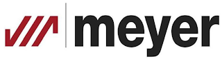 - DM0000: The mark consists of three red vertical, parallel lines which are evenly spaced and slanted toward the right. The first line appears as a check mark, the last line looks like an inverted check mark. A solid grey, vertical line is to the right of the parallel lines. The word "MEYER" is in a black font and is to the right of the grey line in lower case letters. The color white is intended to show background.