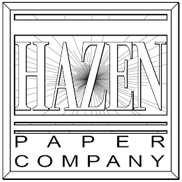 - DM0000: The mark consists of a rectangular bar, containing starburst ray design lines, positioned above the word "HAZEN", appearing in large type, overlaying a starburst design, and enclosed in a rectangular box, positioned above two rectangular bars, containing starburst ray design lines, positioned above the word "PAPER", in small type and fully justified over the word "COMPANY", all enclosed within a 3-D square frame.