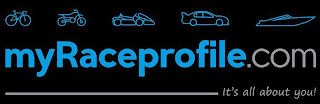 DM0000: The mark consists of a stylized design comprised of blue outline designs of a bike, motorcycle, racecar, car, and boat, above the word, "MYRACEPROFILE.COM", with "MYRACEPROFILE" in a bold blue font and ".COM" in a gray font, above a gray horizontal line next to the words, "IT'S ALL ABOUT YOU!" in small gray font; the black background is not part of the mark.