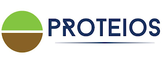 - DM0000: The mark consists of the stylized word "PROTEIOS" in blue above a blue horizontal line that fades toward the left and right ends all to the right of a circle with a horizontal break between a top half in green and a bottom half in brown. The color white represents background and does not form part of the mark.