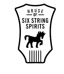 DM0000: The mark consists of the stylized word HOUSE on top of the stylized word OF with a line on both sides. Below the word OF is the stylized wording SIX STRING on top of the stylized wording SPIRITS. Below the word SPIRITS is a horse design on top of six stylized lines and all enclosed in a guitar head design.