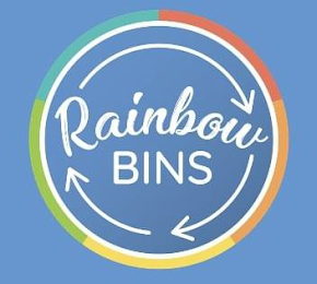 - DM0000: The mark consists of the stylized white wording "RAINBOW" over "BINS" within three white arrows forming a clockwise circle, which are located inside a circle containing equal-sized colored sections in red, orange, yellow, green, and blue, all on a blue background.