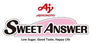 DM0000: The mark consists of the wording "AJ" in stylized red letters and below it is the term "AJINOMOTO" in stylized red letters of smaller size. Below is the wording SWEET ANSWER in stylized black letters of larger size over a pink oval; the wording SWEET ANSWER and the oval have two outer borders one white and one black. Below this design are the words Low Sugar, Good Taste, Happy Life in stylized black letters of smaller size.