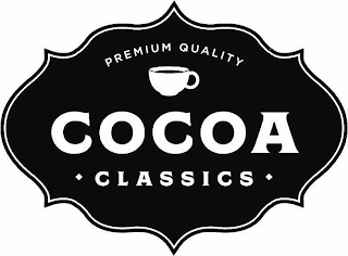 DM0000: The mark consists of the words "COCOA CLASSICS", with the word "CLASSICS" appearing below the word "COCOA" and between two smaller rectangular designs; a drawing of a mug filled with liquid above the words "COCOA CLASSICS"; and the words "PREMIUM QUALITY" above the drawing of the mug, all of which are contained within a pointed oval background. There is an inner border within the oval background.