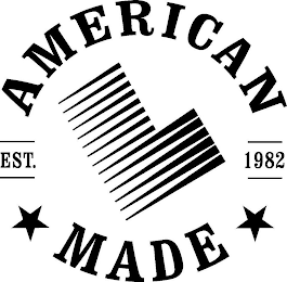 DM0000: The mark consists of "L AMERICAN MADE EST. 1982" in stylized font. "American" appears on the top line of the mark, "Made" appears at the bottom of the mark and has a stylized star to the left and the right. A stylized "L" appears in the middle and is formed by lines that start fine and become thicker. On the left of the "L" is "EST." and to the right of the "L" is "1982". The "EST." and "1982" have a line above and below.