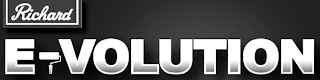 - DM0000: The mark consists of the wording "RICHARD E-VOLUTION" in stylized font. "RICHARD" appears in a rectangular design with a solid rectangle and a partial concentric single-line rectangle. The hyphen in "E-VOLUTION" is formed by a paint roller. The shaded rectangle appearing as background for the entire drawing represents transparent areas, and is not part of the mark.
