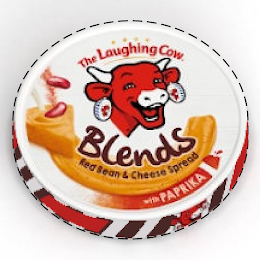 DM0000: The mark consists of of a cylindrical container. On the top portion of the container is the wording "THE LAUGHING COW" in red with four gold stars above the wording and a gold slim arched underline of the word "LAUGHING". Below the wording is a red shaded head of a cow outlined in black with white horns, eyes, nose, and lips and earrings made of a cylindrical shape with the red shaded cow head and blue and white stripe border. Below the cow head is the word "BLENDS" in brown above a gold smear with brown flecks and the words "RED BEAN & CHEESE SPREAD" in brown superimposed therein, above a further red band with the wording "WITH PAPRIKA" in white superimposed therein. To the left of the word "BLENDS" is a gold cheese triangle flecked with brown with a stream of white milk and two red beans pouring into the triangle. On the side of the container are brown diagonal stripes and the same image of the red shaded cow head. The broken lines depicting the circular edge of the packaging indicate placement of the mark on the goods and are not part of the mark.