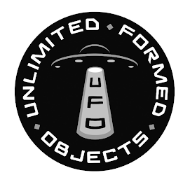 DM0000: The mark consists of round configuration with "UNLIMITED FORMED OBJECTS", with diamonds/squares between the words "Unlimited Formed Objects", around the border and a stylized space ship with a stylized light beam that includes "UFO" emanating from the spaceship in the center of the logo.