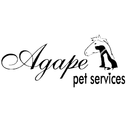 - DM0000: The mark consists of the word "AGAPE" in script lettering. A stacked silhouette drawing of a horse head, a dog, and a cat appear to the right of the wording. The words "PET SERVICES" appear in lower case lettering with a heart over the "I" in "SERVICES", and the wording is situated beneath the drawing of the horse head, dog, and cat.