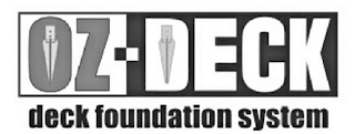 DM0000: The mark consists of the word "OZ-DECK" inside of a rectangle, wherein the dash between "OZ" and "DECK" consists of a smaller rectangle. Inside of the letter "O" in "OZ" and "D" in "DECK" are drawings of a post anchor. Below "OZ-DECK" is the phrase "DECK FOUNDATION SYSTEM" in stylized lower case letters.