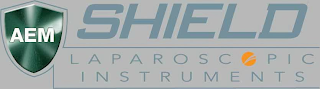 DM0000: The mark consists of the word "SHIELD" in dark grey italics over the words "LAPAROSCOPIC INSTRUMENTS" in dark grey stylized front where the second letter "O" in "LAPAROSCOPIC" is formed by an image of a blood vessel profile in orange. To the left of the words "SHIELD" and "LAPAROSCOPIC INSTRUMENTS" are the letters "AEM" in white within an image of a green shield with white highlights. A single dark grey line appears above "LAPAROSCOPIC INSTRUMENTS" continues around the shield image and appears below "LAPAROSCOPIC INSTRUMENTS" with the portion of the line appearing around the shield image being outlined in white. The mark appears on a grey background.