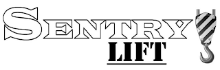 - DM0000: The mark consists of the word "SENTRY", with the letters in outline font, above the underlined word "LIFT" in solid letters, and a pulley block and hook, to the right of the words, with the pulley block having diagonal stripes.
