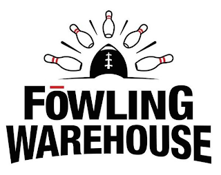 - DM0000: The mark consists of a stylized logo featuring five white bowling pins outlined in black with double stripes on the neck in red and four lines above a football and a horizontal line in black above the stylized wording FOWLING WAREHOUSE in black with the F and the G of FOWLING in larger font and a horizontal line in red over the O in FOWLING.