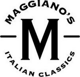 DM0000: The mark consists of the letter "M" appearing between two horizontal lines in a stylized font. The word "MAGGIANO'S" appears in a stylized font in an arc above the letter "M", and the words "ITALIAN CLASSICS" appear in a stylized font in an arc below the letter "M".