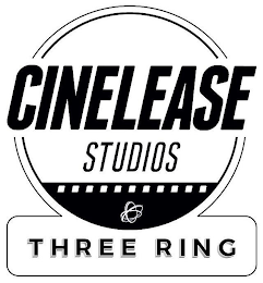 DM0000: The mark consists of the stacked stylized wording "CINELEASE STUDIOS", with "CINELEASE" appearing at the top and "STUDIOS" appearing at the bottom. The term "CINELEASE" appears across an incomplete circle design, while "STUDIOS" is contained within the incomplete circle. A stylized film strip design also appears within the lower portion of the incomplete circle with an interloping concentric circle design beneath the term "STUDIOS". The entire design is outline by another incomplete circle that connects to an incomplete rectangle at the bottom of the circle containing the wording "THREE RING".