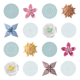 - DM0000: The mark consists of a non-repeating pattern comprised of alternating origami flowers and circles forming a four-by-four square. The top row consists of a teal circle with white lines; a pink origami flower with five petals; a teal circle filled with a geometric pattern of white lines; and a beige origami flower with sixteen exterior points. The second row consists of a blue origami flower with four petals; a light teal circle filled with a geometric pattern of grey lines; a round white origami flower with a green origami center; and a light teal circle filled with a geometric pattern of grey lines. The third row consists of a teal circle filled with a geometric pattern of white lines; a yellow origami flower with sixteen exterior points; a teal circle with white lines; and a pink origami flower with five petals. The bottom row consists of a round white origami flower with a yellow origami center; a light teal circle filled with a geometric pattern of grey lines; a brown origami flower with four petals; a light teal circle filled with a geometric pattern of grey lines.