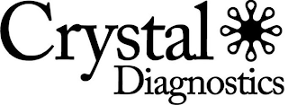 - DM0000: The mark consists of the words "CRYSTAL DIAGNOSTICS" with the word "DIAGNOSTICS" positioned below the word "CRYSTAL" and offset to the right with the letter "D" in the word "DIAGNOSTICS" being positioned directly beneath the letter "S" in the word "CRYSTAL", and a star shaped splash design positioned to the right of the word "CRYSTAL" and above the word "DIAGNOSTICS" , the splash design having a circular center portion and eight equally spaced apart arms extending radially outwardly therefrom, each of the spaced apart arms having an egg-shaped tip with an egg-shaped aperture or opening formed therein.