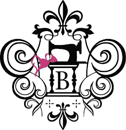 - DM0000: The mark consists of a letter "B" between the two legs of a table of an old style sewing machine with a sewing machine on top; a bra in fuchsia purple is positioned on the left side of the table, and the entire image is encircled with a border design of curves with a fleur-de-lis above and below; to the sides of the bottom fleur-de-lis are two designs consisting of plus symbols with a dot in the center; the letter "B" sewing machine, table, curves, fleur-de-lis, and plus symbols are all in black; the color white represents background, outlining, shading and/or transparent areas and is not part of the mark.