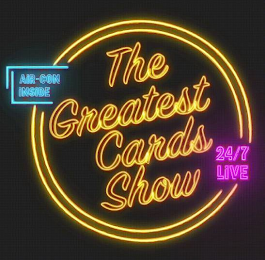 DM0000: The mark consists of the wording "THE GREATEST CARDS SHOW AIR-CON INSIDE 24/7 LIVE" in stylized letters whereby "THE GREATEST CARDS SHOW" is featured in gold and contained within the interior outline of a concentric gold circle, and imposed on the upper left side of the circle is "AIR-CON INSIDE" featured in blue and framed within the outline of a stylized blue rectangle, and imposed on the lower right side of the circle is "24/7 LIVE" featured in pink. All the foregoing appears on a solid black background in the shape of a square.