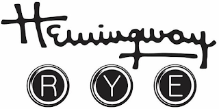 - DM0000: The mark consists of the word "HEMINGWAY" in script font above the word "RYE" in another font. The word "RYE" appears as typewriter keys with the letter "R" in one key circle, the letter "Y" in the next key circle, and the letter "E" in the last key circle.