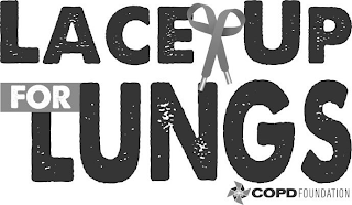 DM0000: The mark consists of the words LACE UP FOR LUNGS in stylized lettering. The words LACE UP appear above the words FOR LUNGS. There is a shoe lace design between the words LACE and UP. The word FOR appears within a shaded box design located at the top of the letter 'L' in the word LUNGS. Beneath the letters 'G' and 'S' in the word LUNGS are the words COPD FOUNDATION in stylized lettering. To the left of the words COPD FOUNDATION is a stylized configuration of multiple triangles surrounding a rendering of lungs.
