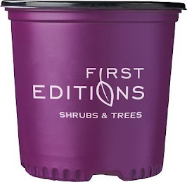 DM0000: The mark consists of a three-dimensional configuration of product packaging in the form of a pot for containing live plants where the outside of the pot is purple and the wording "FIRST EDITIONS SHRUBS & TREES" appears in stylized white font thereon with a white outlined leaf design replacing both the letters "I" in "FIRST" and "O" in "EDITIONS." The broken lines depicting the shape of the pot indicate placement of the mark on the goods and are not part of the mark.