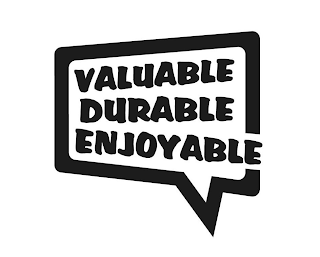 DM0000: The mark consists of the lines in the shape of a dialog box and the stylized wording "VALUABLE DURABLE ENJOYABLE" inside the box.