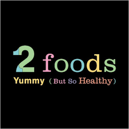 DM0000: The mark consists of the stylized wording "2 FOODS YUMMY (BUT SO HEALTHY)" appearing on a black background. The number "2" is in blue and green. Each letter in the word "FOODS" appears in a separate color, with the letter "F" in pink, the first letter "O" and the letter "S" in green, the second letter "O" in blue, and the letter "D" in yellow. The word "YUMMY" is in yellow. Each word in the wording "(BUT SO HEALTHY)" appears in a different color between the open parenthesis in green and the closed parenthesis in blue, with the word "BUT" in pink, the word "SO" in purple, and the word "HEALTHY" in orange.