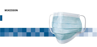 - DM0000: The mark consists of the image of a blue and white face mask depicted against and in front of a two-row checkered, shaded, textile pattern depicted in blue with the blue color getting gradually lighter from left to right. The wording "MCKESSON" in black is positioned in the top left corner of the drawing of the mark above a blue rectangle.