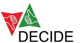 - DM0000: The mark consists of the stylized black wording "DECIDE", down and to the right of a red downward facing arrow containing a thumbs-down design in negative space, and a green-upward-facing arrow containing a thumbs-up design in negative space appearing above the "DE" in "DECIDE". The color white is not claimed and represents background.