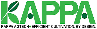 DM0000: The mark consists of First line: KAPPA. First line includes stylized elements of the letter K, incorporating stylized "leaf" and "stem" elements to form the parts of the letter "K", and stylized circles in place of horizontal element of the letters "A". Colors of the first line are dark and light shades of green. Second line text: KAPPA AGTECH+EFFICIENT CULTIVATION. BY DESIGN. Second line includes elements "+" and "." in shades of green, with either black or white text.