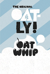 DM0000: The mark consists of the words THE ORIGINAL in rounded black caps small size print. Below are the characters OAT- in white caps large print, with the inside of the letter A replaced with the silhouette of a tree, followed under by the characters LY! in black caps large print. The characters OAT-LY! are stylized to appear as if they were cut out by scissors. Below are the words OAT WHIP stacked, printed in extra bold black fonts, medium size with rounded corners and a white shadow mark at the top left of each character, with the letter O replaced by the illustration of a cherry. The expression THE ORIGINAL OAT-LY! is overlapped on a pattern of light and medium light blue wide stripes positioned diagonally, while the words OAT WHIP are overlapped on a white outline of a dollop of whip with a speech bubble to the right of the peak.