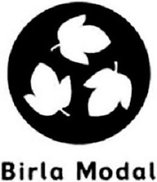 - DM0000: The mark consists of a shaded circle with three leaves placed in the circle above the words "BIRLA MODAL" in stylized font.