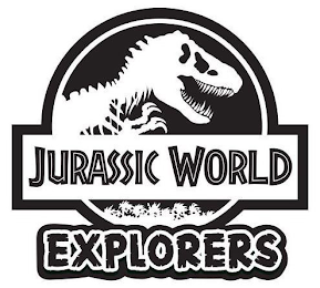 - DM0000: The mark consists of a circle containing a drawing of a dinosaur skeleton in profile intersected by a rectangle containing the stylized words "JURASSIC WORLD" superimposed over the lower portion of the circle with trees silhouetted below, all above the stylized words "EXPLORERS".