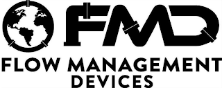 DM0000: The mark consists of a globe with the continents of North America, South America, Europe, and Africa outlined with pipes. The letters "FMD" consisting of pipes to the right of the globe, with the words "FLOW MANAGEMENT DEVICES" underneath the globe and letters "FMD".