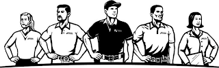 - DM0000: The mark consists of an image of five uniformed people. The women are wearing long sleeve shirts and the men are wearing short sleeve shirts. The first person is a women wearing a headset. The second person is a bearded man with a visible belt buckle and a tape measure attached to the belt. The third person is a man with a visible belt buckle wearing a baseball cap. The fourth person is a man with a visible belt buckle and a tape measure attached to the belt. The fifth person is a woman carrying a notebook. A curved line extends from left to right and connects the people just below the waistline such that the lower portions of their bodies are not visible.