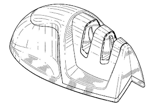 - DM0000: The mark consists of a three-dimensional configuration of goods consisting of the overall shape of a manual knife sharpener having on one half a rounded upper surface with tapered sides terminating at a flattened horizontal lower surface on each side and on the other half a pair of cavities each containing pair of crossed blades at pre-set angles terminating midway toward the lower surface and an inverted V-shaped bottom running parallel with the length of the sharpener with flattened lips on each side of the inverted V shape. The matter shown by the broken lines is not a part of the mark and it serves only to show that the crossed blade sharpening elements located in the two cavities of the sharpener are not claimed as part of the mark. The lines of the knife sharpener itself are intended to indicate the three-dimensional shape of the knife sharpener and do not indicate color. All elements of the drawing constitute and are claimed as part of the mark except for the sharpening elements encompassed by the broken lines.