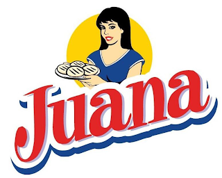 - DM0000: The mark consists of a yellow partial circle design on which appears the design of the upper portion of a woman design having beige skin tone, long black hair, black eyes and red lips wearing a blue V-necked top with short sleeves which has a white border on the neckline and sleeves, who is holding a white plate of beige round baked goods with black stripes; below this design is the word "JUANA" in red stylized letters which are outlined in white and gray, and outlined in blue on the bottom; the right ans left side of the top portion of the letter "J" are outlined in blue and there is a blue apostrophe like mark to the right of the letter "a" in the word "Juana".