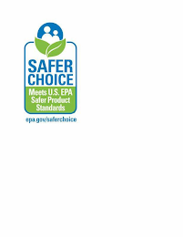 DM0000: The mark consists of a white and green box with curved corners and blue borders and the words "SAFER CHOICE" in blue on a white background above the words "MEETS U.S. EPA SAFER PRODUCT STANDARDS" in white over a green background. At the top of the box are two human figures in white featured within a partial blue sphere above two green leaves with white borders and one leaf bisected by a curved white line. The URL "EPA.GOV/SAFERCHOICE" appears in blue beneath the box.