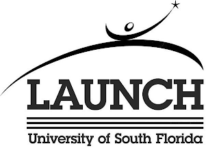 DM0000: The mark consists of a stylized anthropomorphic shape formed by two arcs representing arms and legs, the shape above the word "LAUNCH" on a first line and "UNIVERSITY OF SOUTH FLORIDA" on a second line, the first and second lines separated by three vertically spaced, horizontal lines.
